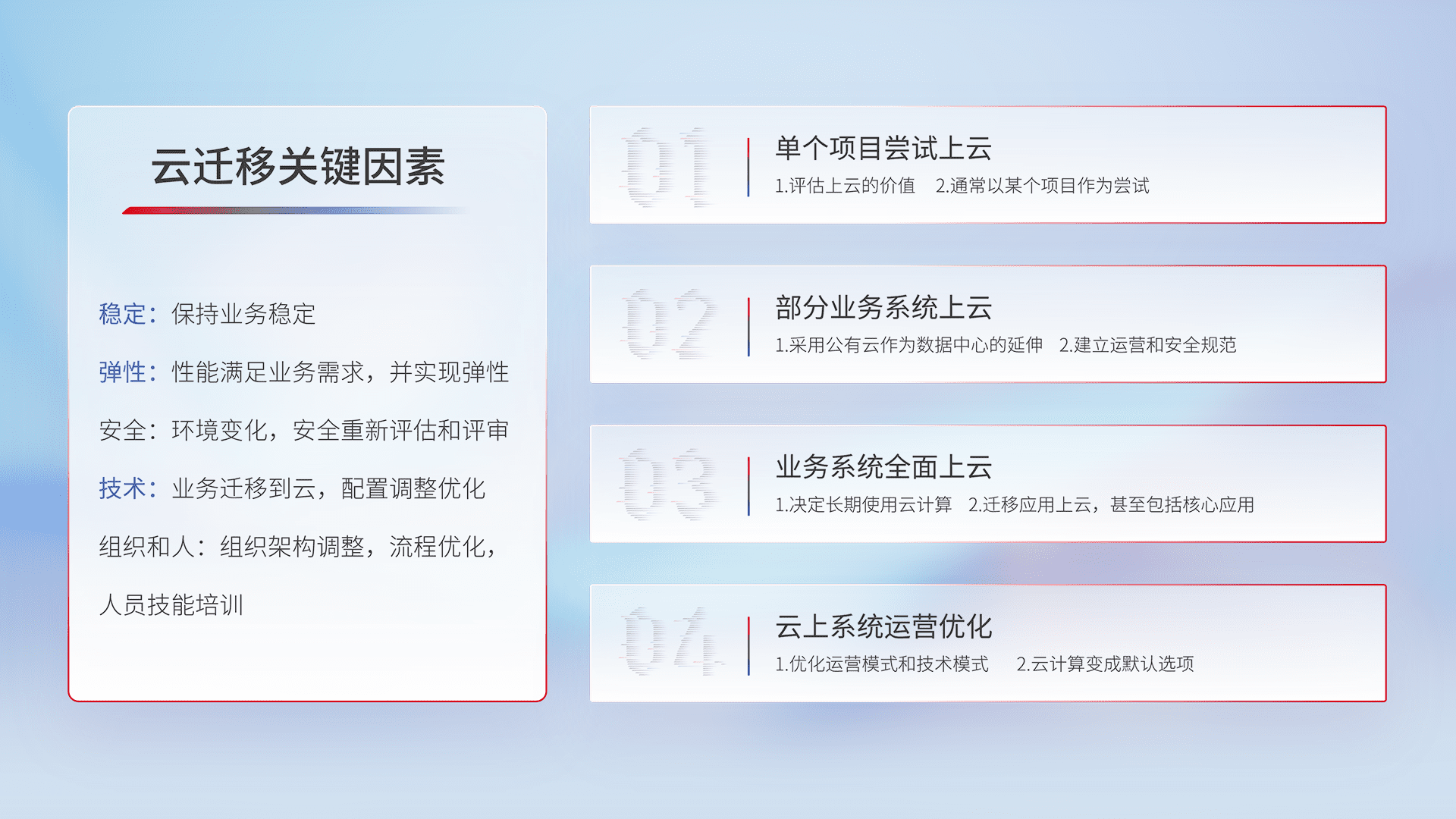 结合实际业务,,,,从规划设计、、、、云平台选型、、、云原生改造、、、数据迁移、、、、集成交付,,,,迁移全过程为客户识别最佳上云路径,,,做好风险识别管理,,,,设计网络架构、、、、身份权限、、、、安全审计合规、、、操作审计、、、、日志审计、、、、监控告警策略、、、、多站点容灾设计等,,,对云上基础设施进行整体规划,,提升IT治理水平,,,以满足弹性、、高可用、、、高性能的需求。。